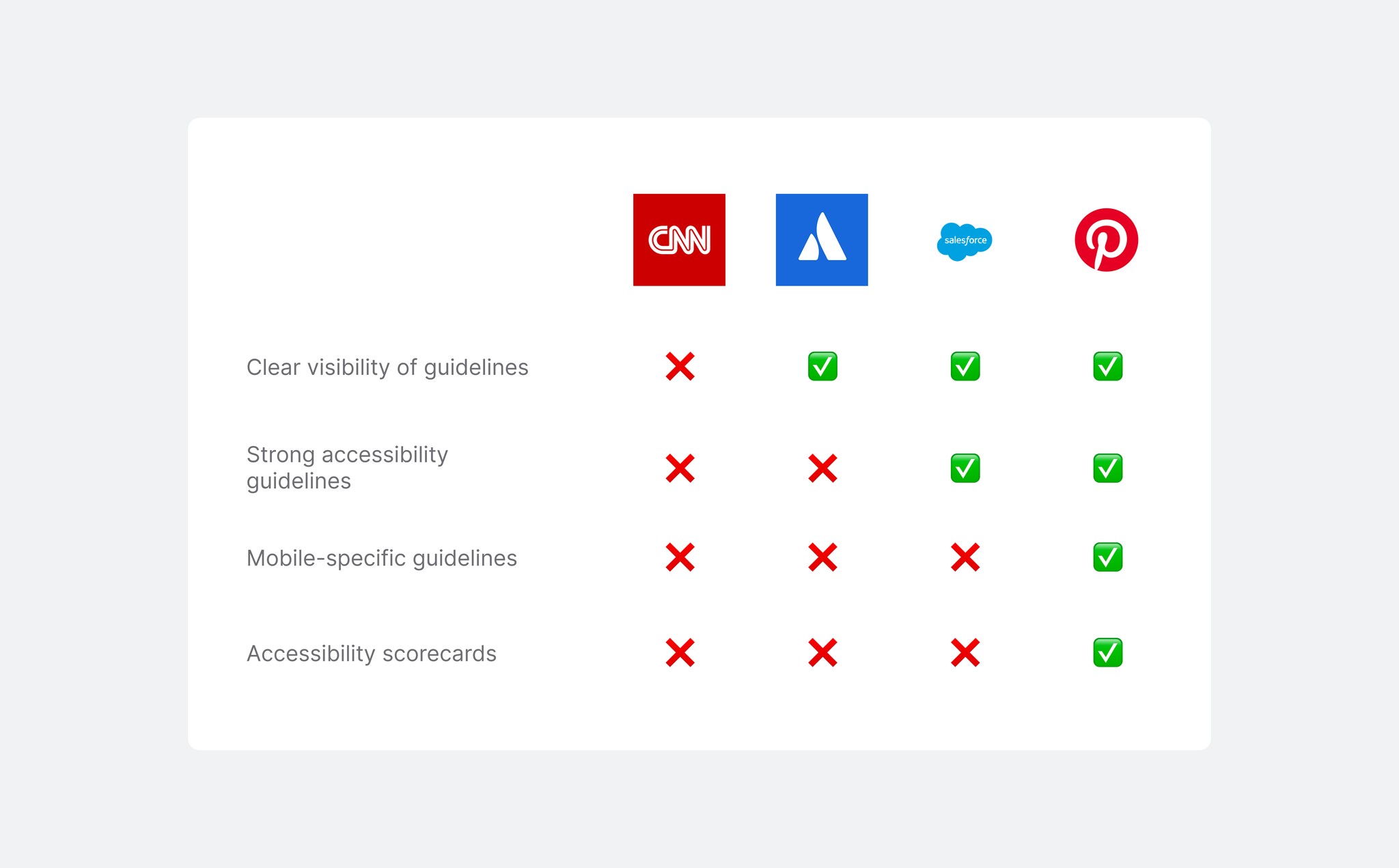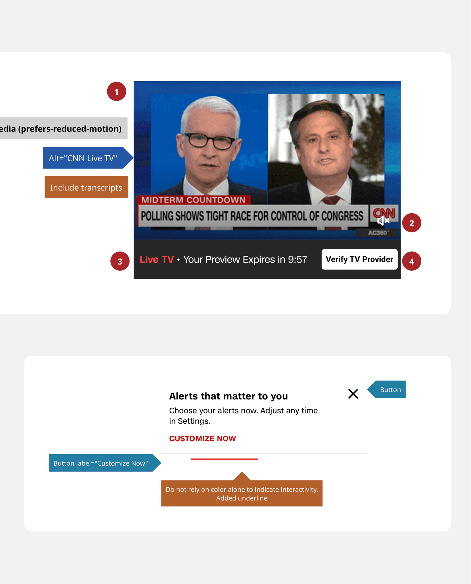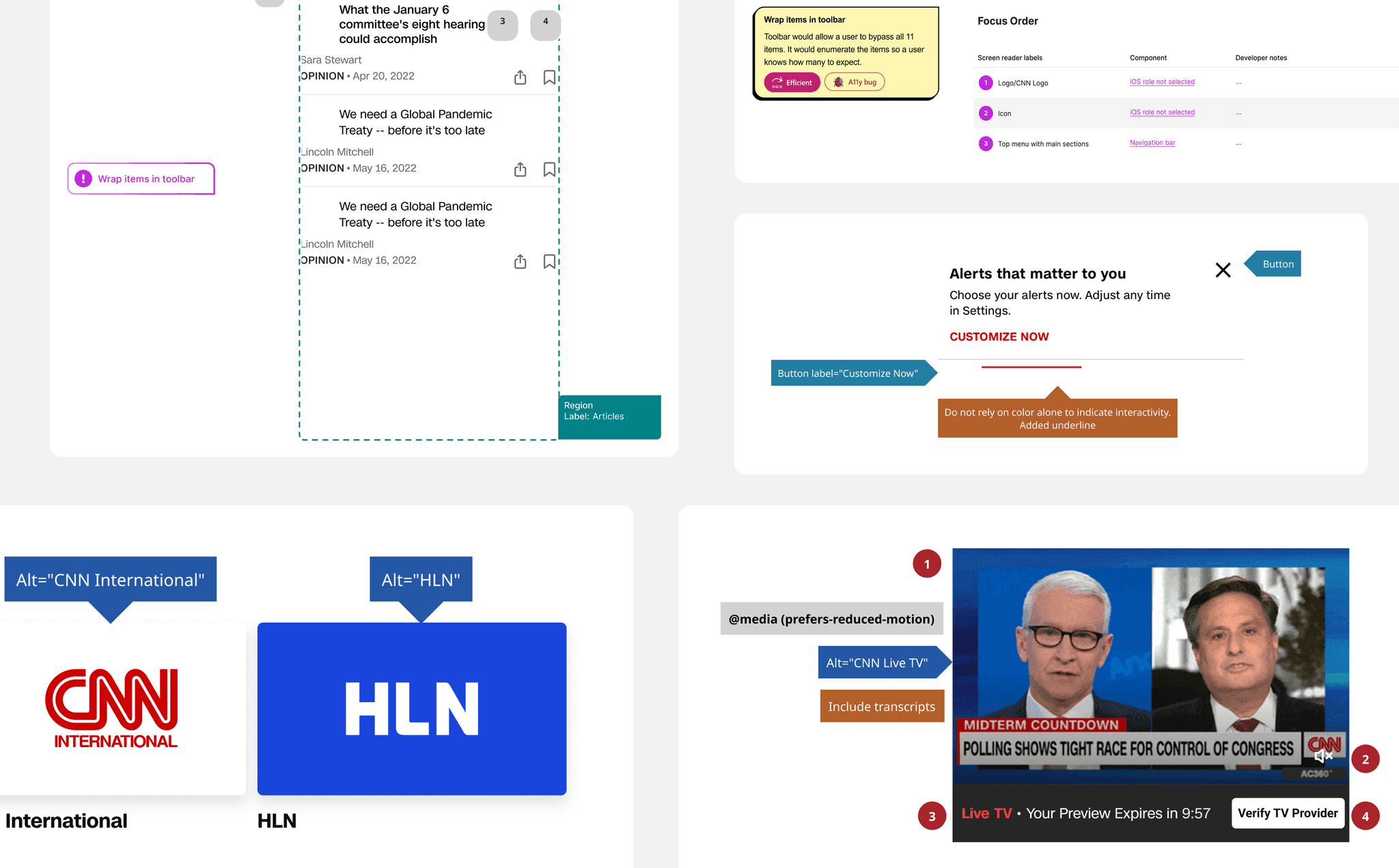 While CNN is lacking in accessibility compared to other platforms, this provides a great area of opportunity to embed accessibility into the foundation of it's design system and product strategy.